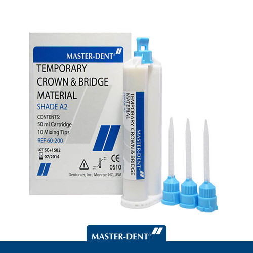 معرفی کوتاه: ماده ساخت روکش (کراون و بریج) موقت با بیس رزینی (کامپوزیت) سلف کیور، مناسب روکش موقت، بریج، اینله و انله – ماندگاری تا 80 روز – استفاده با گان 1:1 و 2:1 – عرضه شده در سه شید A1, A2, A3 – محتویات: کاتریج 50 میلی لیتر + 10 عدد Mixing Tip آبی