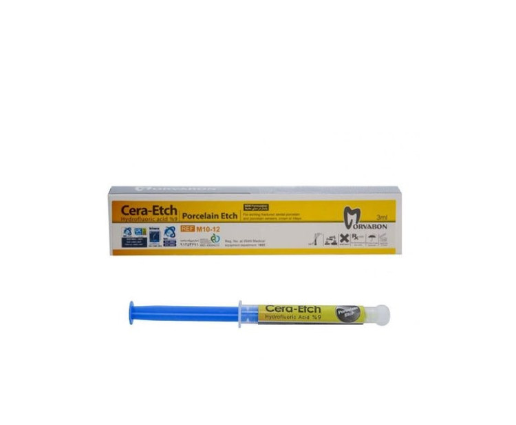 اسید HF مروابن حاوی 9 درصد هیدرو فلوئوریک اسید (Hydro Fluoric Acid) آماده سازی سطح پرسلن برای باند قویتر با رزین و کامپوزیت جهت ترمیم پرسلن شکسته و رستوریشن های تمام چینی مواد رنگ زای مجاز
